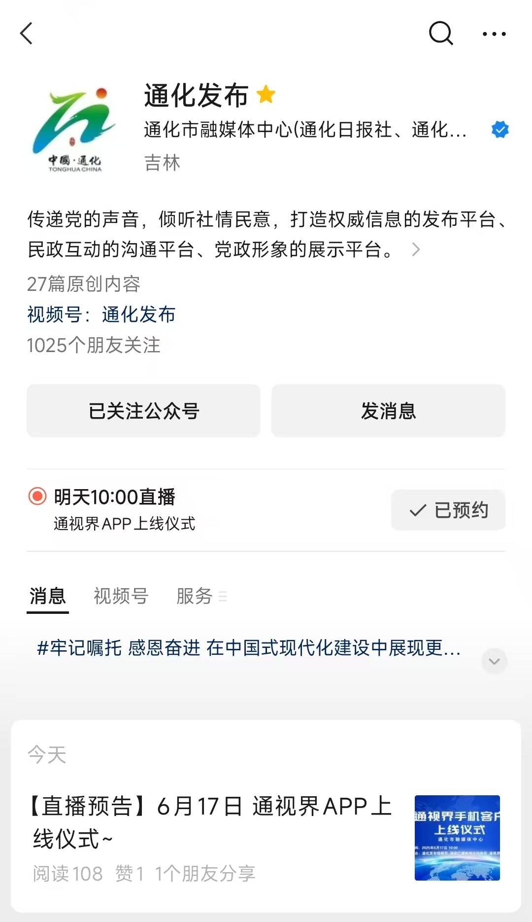 微信搜索通化发布视频号关注即可观看直播